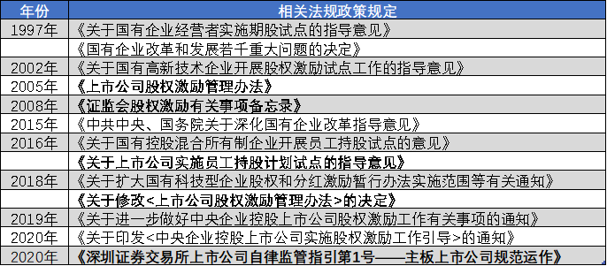 1993年,万科作为深市老五股,特区标杆企业,成为了我国资本市场第一个进行股权激励的企业。紧接着,1997年,上海仪电控股集团和天津泰达股份有限公司成为第一批参与股权改革的国企,资本市场发展进入快车道,一系列与股权激励相关法规颁布。