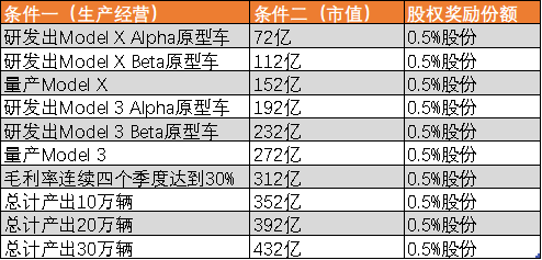 马斯克和董事会签署的这份股权激励方案,分为生产经营要求和企业市值要求,每完成一项生产经营,同时达到一级市值要求,即可解锁股权奖励。条件设置分成阶梯式,这种设计的巧妙之处便在于,虽然部分要求很高,但管理者因为既有短期目标,又具备长期预期,看得见够得着,十分显著地提高了管理者的积极性。