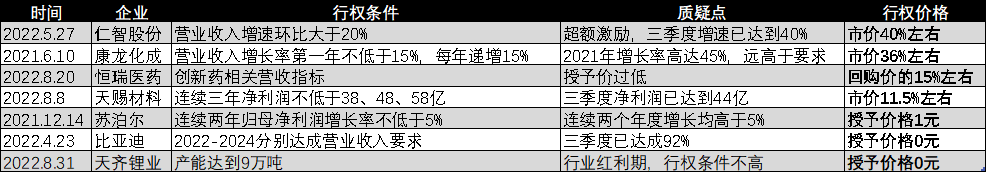 今年以来,比亚迪发布了股权激励政策,营收增速要求为第一年30%,后续两年20%,截至三季度,比亚迪就已经完成了第一个解锁期,营收要求的93%。最关键的是,行权价格是0元,免费送股给管理层和员工。同样的,天赐材料、苏泊尔、天齐锂业在发布股权激励后,也都受到了投资者的质疑,各家的股权激励政策变得越来越卷,有顺手割外部投资者韭菜嫌疑。