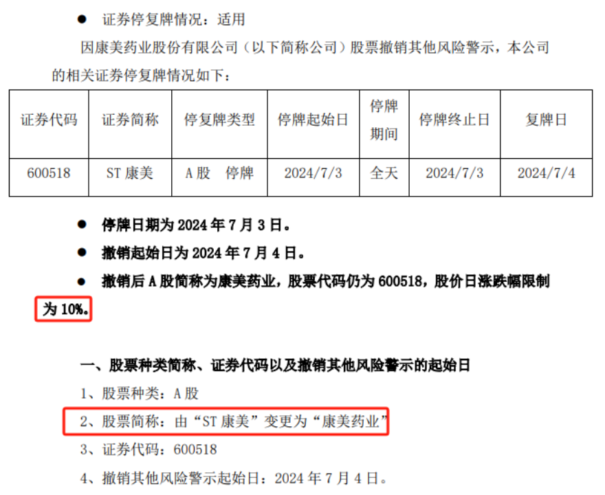 7月2日晚,康美药业发布公告称,公司股票将于7月3日停牌1天,7月4日复牌并撤销其他风险警示。撤销其他风险警示后,公司股票转出风险警示板交易,股票价格的日涨跌幅限制由5%变更为10%,公司股票简称由“ST康美”变更为“康美药业”。