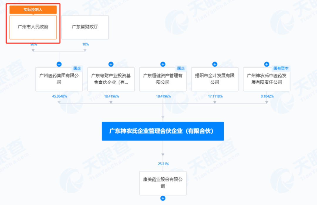 源媒汇通过天眼查发现,广东神农氏背后的控股股东为具有国资背景的广药集团。
