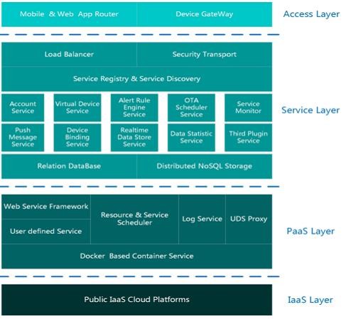 这是我们做的一套云平台的技术栈架构图,前页ppt介绍过,我再简单的介绍一下,这是设备接入和APP的接入。中间是各个功能组建,我们通用的帐号服务,设备管理服务等等,下面就是微服务的开发框架,我们可以自己写这个服务逻辑,最底层这个IaaS跟我们自己做的不太相关了,但我们对其依赖耦合度低,很容易迁移以及跨地域、跨服务商部署。