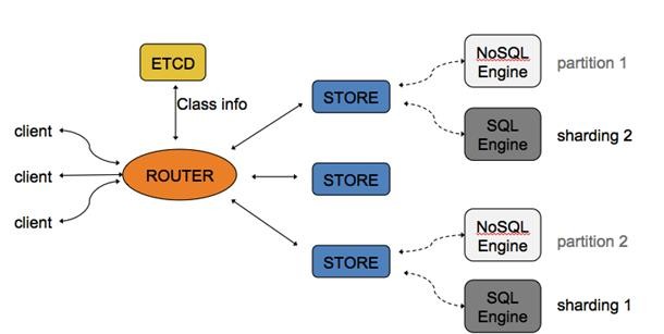 这是一个存储的简单的架构。这个和前面的比较类似。这是核心的组件,核心组建就是这两块ETCD和Router。ETCD是一个很重要的中心存储,这个是存储元数据,因为我们后端有很多的服务以及厂商的UDS。 Router就会发现里面所有的服务,客户端发给router,router然后再把这个消息发送到服务的上面。