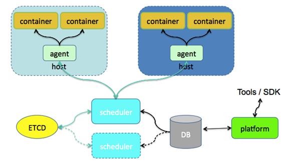 这个就是一个云服务引擎架构,这个是调度器,各个厂商把自己写的服务放在平台上,在这里面会有一个scheduler他们之间会定期的维护心跳,scheduler会主动的发现自己掌控的agent。Agent端主要我们主要基于当下火热的docker做了很多工作,如果厂商自己开发,采用docker也是会比较快速的。Agent会管理很多的UDS。我们提供了一个java的开发框架。这是一个用户自定义的服务,这个是我们自己的服务,这个是我们开发所有的一套后端平台。