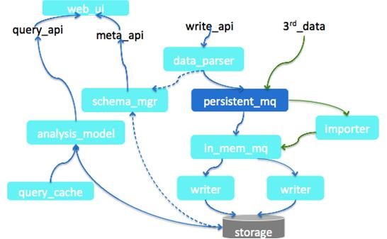 这个可以简单的介绍一下分析平台大体的架构,首先数据写进来,不需要定义表格的schema,所以写进来会有一个数据解析模块,会自动绘解析有什么列、是不是增加列等,其后端会有一个持久化的消息队列。我不知道大家有没有接触过mq,它是一个分布式的上下游解耦中间件。