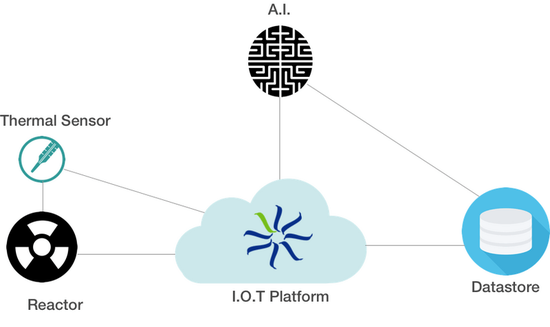 让我们以前面提到的核电站场景为例,除了智能检测、控制所需要的输出量之外,我们也可以增添一种新的功能,如果系统出现了错误,可以作出反应。在这个案例中,我们想让它在过热的时候自动关闭。下面的图片是一个简单的流程图。