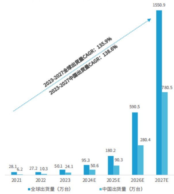 毕竟单在2023年AR设备在全球中以及中国的出货量就已经达到了50万台和24万台!并且还预计了2023-2027年全球AR设备出货量复合增长率为135.9%,而中国复合增长率为138.6%!