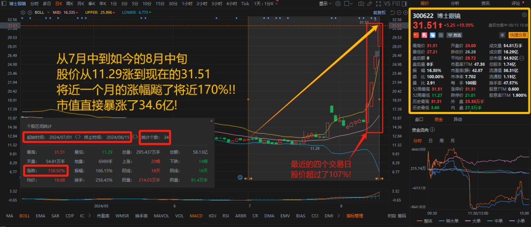 也是因为这些消息,作为AI眼镜龙头股的博士眼镜市值直接翻倍,市值一下子暴涨了34.6亿,目前总市值是接近55亿!并且近4个交易日放量4连涨停,股价涨幅超过了104%!