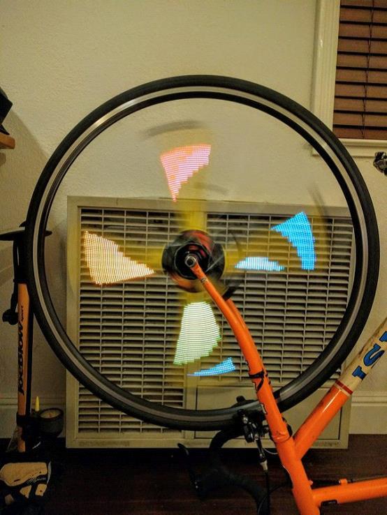 这套系统的工作方式和其他许多自行车灯装置类似:电池和微控制器都安装在车轮的轮毂上。它拥有4根灯条,每一根都可显示1600万色。随着轮子的转动,这4根灯条可以产生有趣的光学错觉。