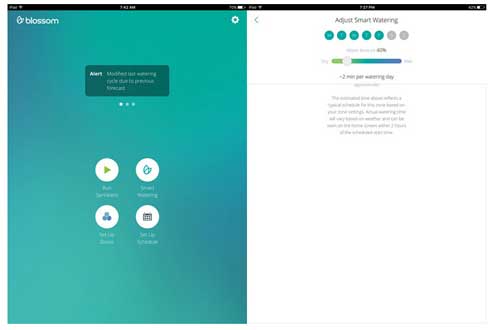 一旦控制器获得了土地的基本信息之后,你就可以设定自动浇水的日期和时间了。Blossom控制其中一个非常强大的功能是:能够根据每天日升日落的变化自动调节灌溉时间。假如说,你设置的是“每天日出之前两个小时浇水”,Blossom也完全能够实现。不过美中不足的是,APP中只能每天设置一次灌溉时间。对于倾斜山坡上的土地灌溉或者是刚播种的草地,每天只能有一次灌溉显然是不够的,而这个重大的功能缺陷Blossom至今还没有应对措施。幸运的是,在今年年底之前,Blossom有可能发布APP的升级版,届时将有可能实现每天多次灌溉的设置。