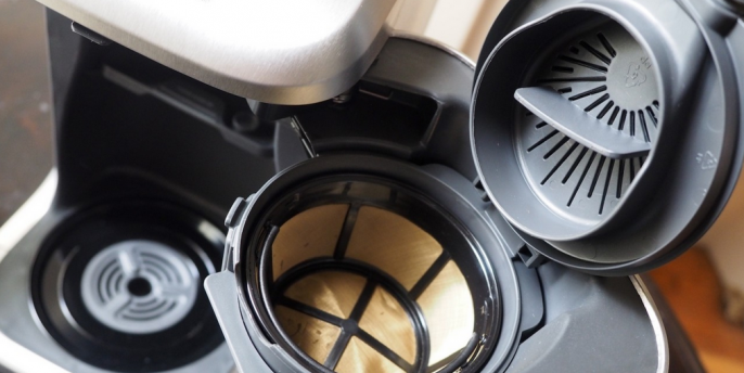 Breville另外不寻常的特点是其封闭的冲泡室。豆荚状,大概是两个拳头合一起的大小,有个铰链盖;可以与Breville提供的goldtone过滤篮配合使用,每次冲洗,或者用平底的纸虑器(因口感和方便,我更偏向这个),完成后可以直接倒掉。目的是冲泡过程防止空气进入,同时保持芳香,更不用说减少热量散失了。