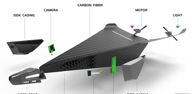 上面搭载着LED灯组以及摄像头,可利用iOS/Android设备及配套应用,通过蓝牙4.0无线操控该无人机。该无人飞行机由3.7伏150mAh的锂离子聚合电池供电,每次充电可进行三分钟的飞行。当然用户也可以选择更大的供电电池,机翼两侧个安装有电机马达,为飞行提供动力。 Carbon Flyer有一个坚固的塑料鼻锥,以保护它免受伤害或伤到人。左右机翼安装有不同颜色的LED指示灯,为用户判断飞机的状态提供指示。搭载的摄像机可以摄制640X480标清视频。