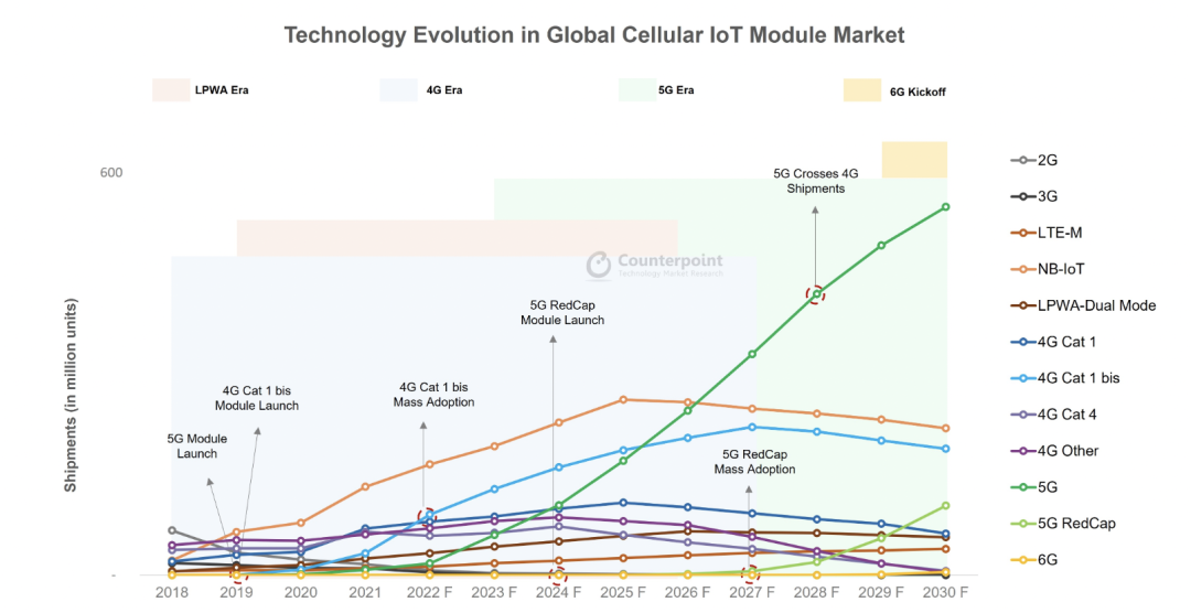 实际上,即使2027年之后,Cat.1模组的出货量开始逐步下滑,其仍不会迅速跌至“others”的范围内,到2030年前其仍将是蜂窝物联的重要制式之一。从Counterpoint的预测数据看,到2030年,Cat.1(含Cat 1.bis)模组的全球出货量或仍在6700万片以上。