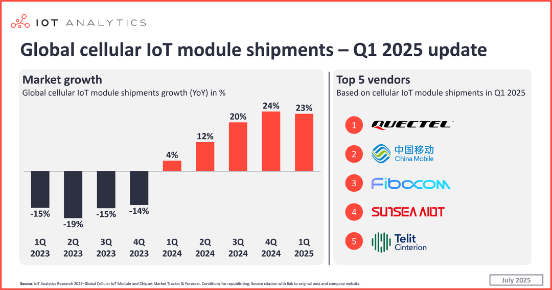 2作者:Sophia物联网智库 原创 2024 年,全球物联网连接数达到 188 亿,其中约有 40 亿(22%)使用蜂窝物联网连接,其中,83%(约 33 亿)依赖于预制蜂窝物联网模组,因此长期关注蜂窝物联网模组出货数据对于洞察整个物联网产业发展具有重要意义。 继前不久市场研究机构 Counterpoint Research 更新了全球蜂窝物联网模组市场数据...