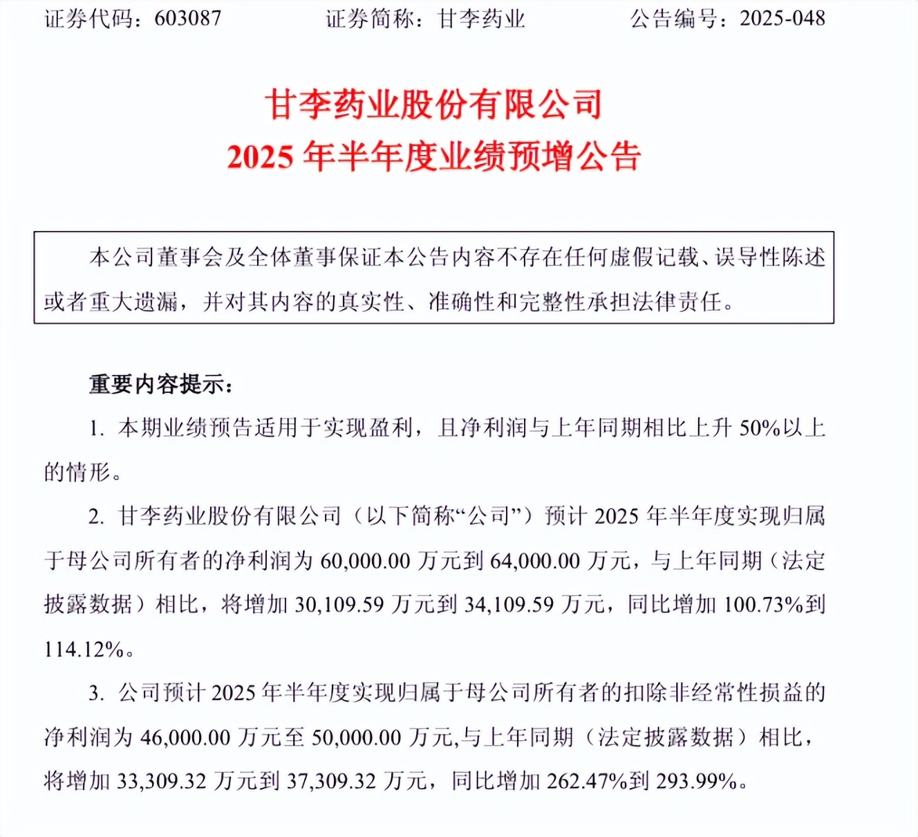 1甘李药业的增长势头还在延续。 根据财报,去年该公司实现营业收入30.45亿元,同比增长16.77%;归母净利润6.15亿元,同比增长80.75%;扣非归母净利润为4.30亿元,同比增长44.85%。 近日,甘李药业也发布了2025年半年度业绩预增公告。公告显示,该公司预计今年上半年实现净利润6亿元至6.4亿元,同比增长100.73%至114.12%;扣非净利...