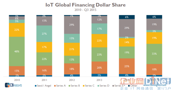 物联网企业融资并不倾向于早期阶段。中期交易的交易额所占份额最高,除了2012年。2015年中期交易占物联网企业融资额的52%。2014年和2015年后期融资分别占22%和31%。