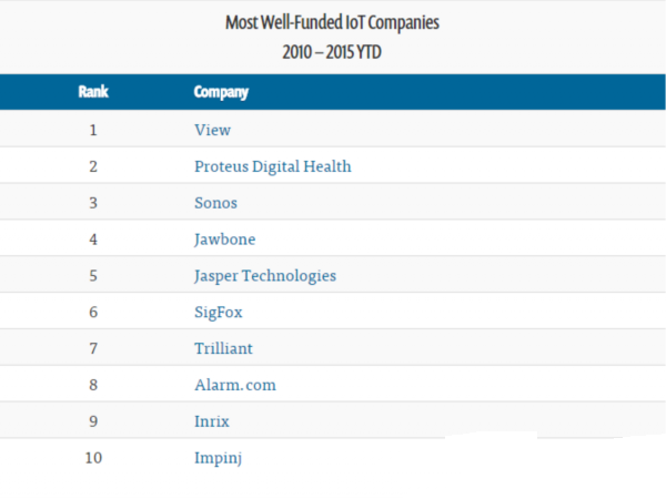 资金雄厚的企业分布在多个类目,包括物联网基础设施、云平台和可穿戴领域。包括,View——联网智能窗户和环保建筑玻璃制造商,第三季度获得G轮投资1.50亿美元。紧随其后的是Proteus Digital Health,主要生产摄食传感器来测量是否坚持服药以及生理反应,第三季度获得G轮投资5200万美元。排在第三位的是Sonos,位于加利福尼亚,联网家庭音响系统制造商,2014年第四季度获得E轮投资1.30亿美元。