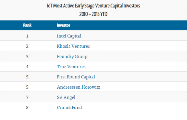 在投资物联网初创企业方面,Intel Capital排在首位,紧随其后的是Qualcomm Ventures,这两家企业都热衷于投资可穿戴初创企业,而这属于物联网的一个分支。
