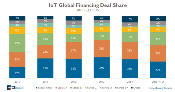 不同阶段物联网交易份额基本保持一致,2013年早期阶段交易达到峰值,种子阶段和A轮交易占62%;2015年第三季度占53%。