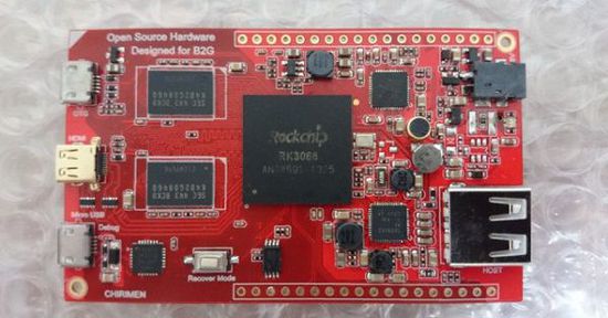 规格方面,Chirimen开发版采用了瑞芯微RK3066 SoC、1GB DDR3 RAM、1GB NAND Flash、2组IC端口、2个UART端口、2个SPI端口、1个可配置GPIO端口、1个microSD卡槽、1个USB端口、以及1个USB microUSB OTG端口。
