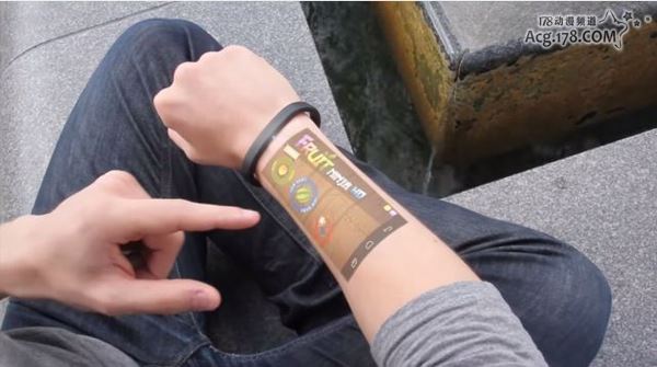 似乎是关于一个叫“Cicret Bracelet”的智能手环:一个橙色、防水的可穿戴设备,可以把智能手机的界面影像投射到手腕的皮肤上,让皮肤成为触摸屏,可以在皮肤上进行触屏操作,把触摸屏体验变成了“触摸皮肤”体验。