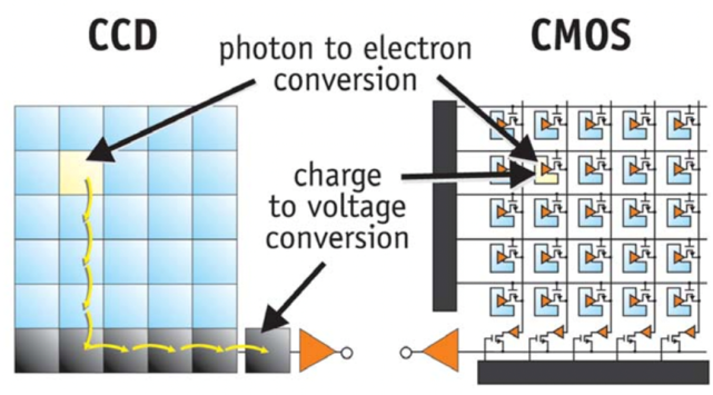 CIS的登场淘汰了CCD传感器,CCD 传感器是一种“电荷耦合器件”。CCD和CMOS图像传感器都通过使用数千个或数百万个称为光点的光捕获井捕获光子来将光转换为电子。拍摄图像时,感光点会被揭开以收集光子并将它们存储为电信号。在 CCD 将光转换为电子,电荷通过芯片传输并在阵列的一个角落读取,模数转换器将每个光点的电荷转换为数字值。