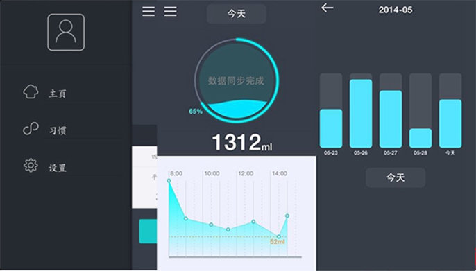 Cuptime智能水杯通过蓝牙与手机APP实现数据传输,打开APP点击主界面的大圆环,就可以自动同步,显示你当天的饮水量,下面会有一个时间轴,表明你在某个时间段喝了多少水。点击上面的“今天”就可以切换到一个以天为单位的界面,你每天用Cuptime喝了多少水都会在这里显示。