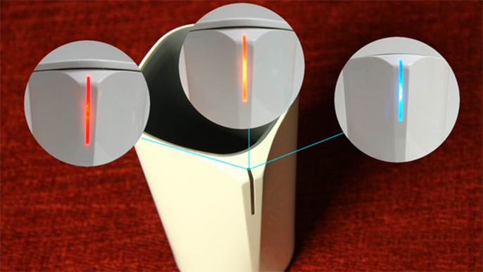 Cuptime看起来是一个不规则象牙白柱体,杯身光泽圆润,很有质感,柱身有一处突起,上面内置了长条状的彩色LED状态灯,整体设计很有科技范儿,放在办公室很显逼格,当然,送礼更是十分合适~