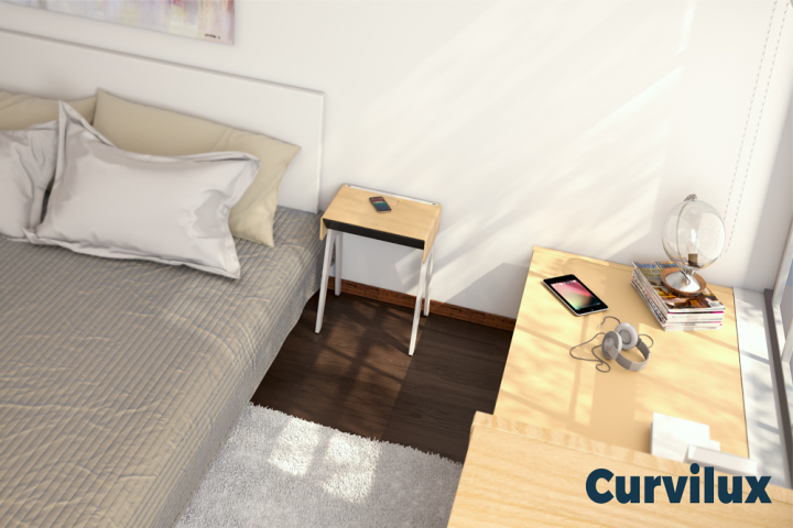 Curvilux智能床头柜配置了两盏LED灯,一盏是床头灯,一盏是智能动作感应夜灯,在你晚上起床的时候照亮地板。通过蓝牙连接和床头柜的立体声系统,用户可以轻松把自己喜欢的音乐设置成早上的闹铃,也可以听着摇滚在床上嗨起来。团队还给床头柜加入无线(和USB)充电功能,以及配有电子锁的抽屉。