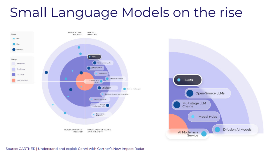 根据Gartner的预测,SLM(也被称为轻量级LLM)的兴起已经成为确定的趋势。小型语言模型SLM弥合了高性能人工智能系统与安全、经济高效的解决方案需求之间的差距。