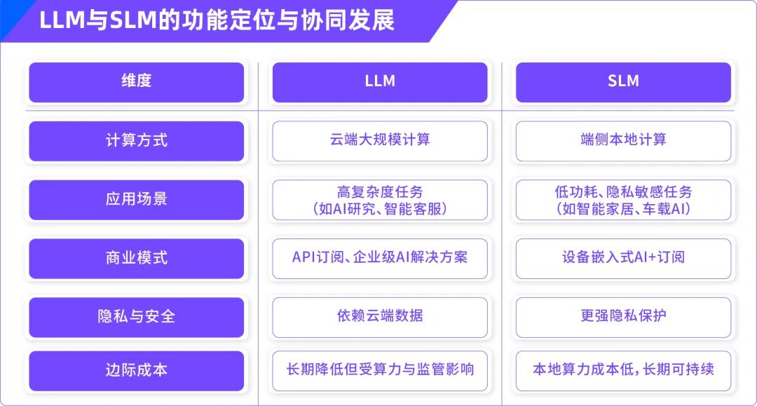 LLM作为“云端AI操作系统”,SLM则扮演着“本地AI计算引擎”的角色,两者在功能定位和商业模式上各有侧重。