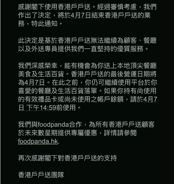 Deliveroo在公告中表示,其业务将于4月7日终止运营,未来将于Foodpanda合作,为香港客户于未来数星期提供专属优惠。但据相关信源,Deliveroo还将向Foodpanda出售部分资产。Foodpanda为德国外卖公司Delivery Hero旗下品牌。