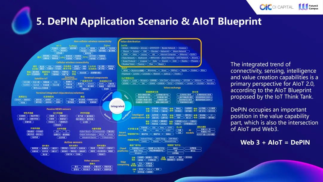 AIoT产业图谱呈现出四个部分:连接、感知、智能和价值能力,以及相应的企业。DePIN在价值能力部分占据重要位置,这也是AIoT和Web3的交叉点,即Web3+AIoT=DePIN。