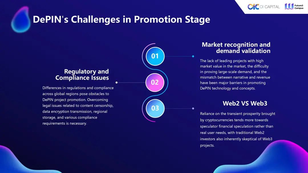 然而,重要的是要意识到DePIN项目在推广阶段面临的挑战。全球各地区的监管和合规问题可能会构成障碍。由于缺乏领先的高价值项目,市场认可度和需求验证可能难以实现。此外,对加密货币投机的依赖以及传统Web2投资者的怀疑态度也可能阻碍进展。