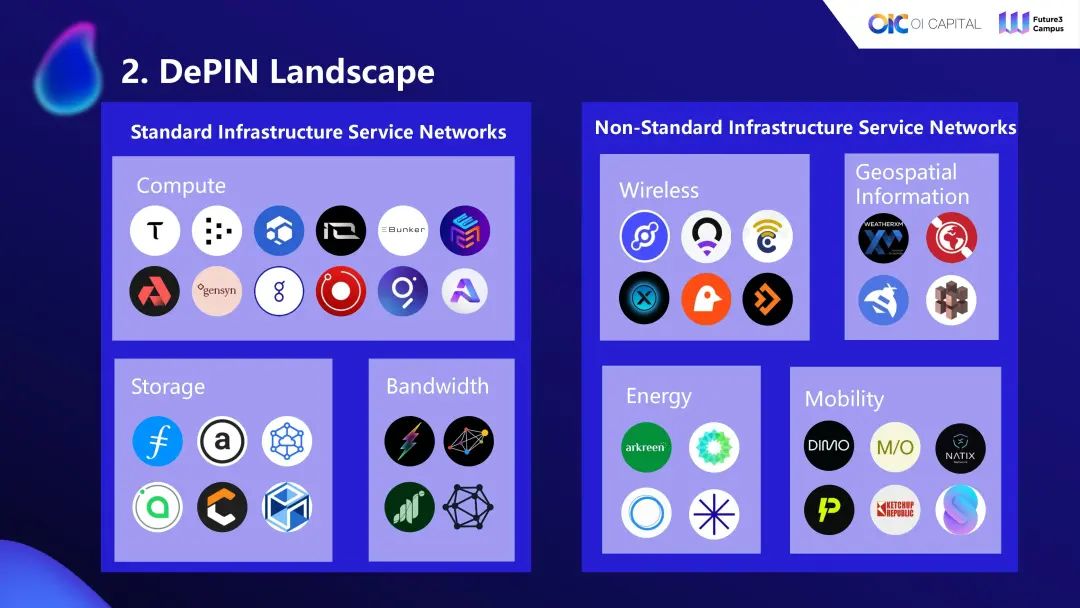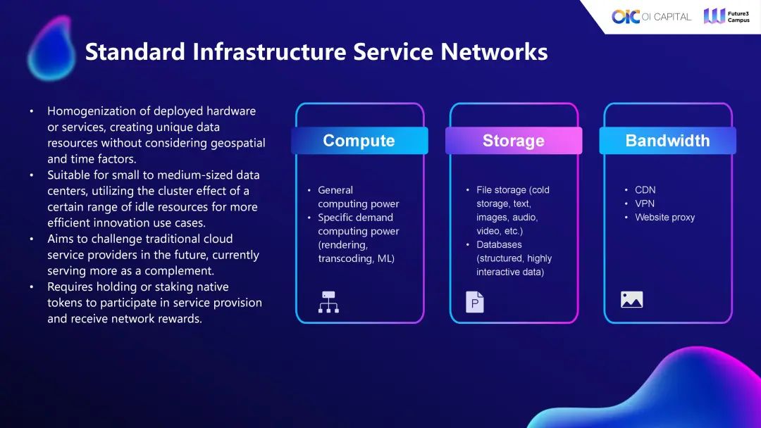 纵观DePIN生态图谱,我们可以将项目分为两大类:标准基础设施服务网络和非标准基础设施服务网络。标准网络包括计算、存储和带宽,而非标准网络则包括无线、地理空间信息、能源和移动性。