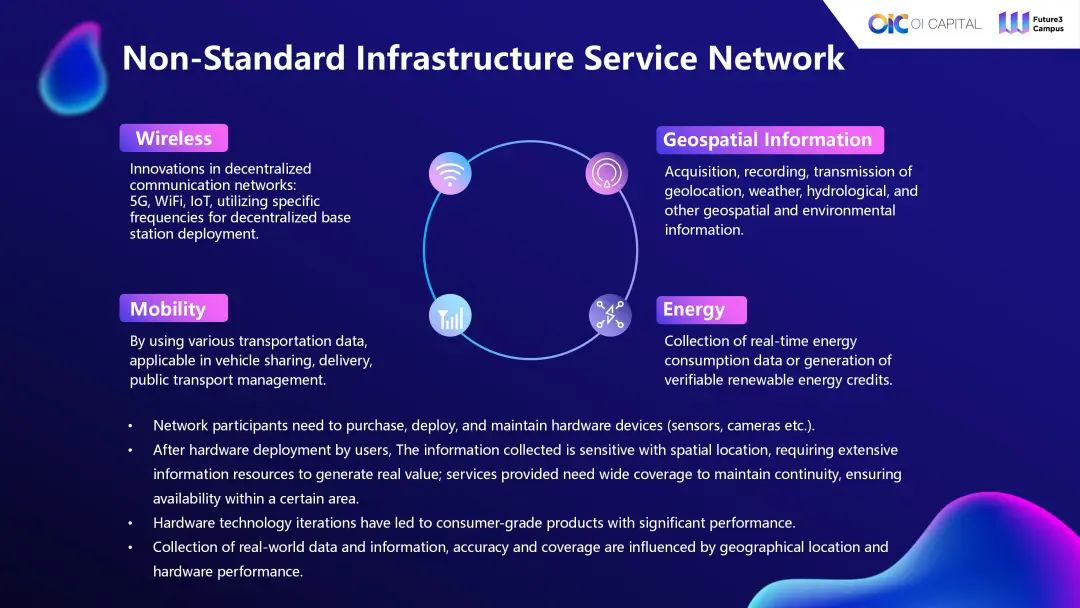 再来看看非标准基础设施服务网络,我们看到去中心化通信网络如5G、WiFi和IoT方面的创新。这些网络还涉及移动性、地理空间信息和能源。