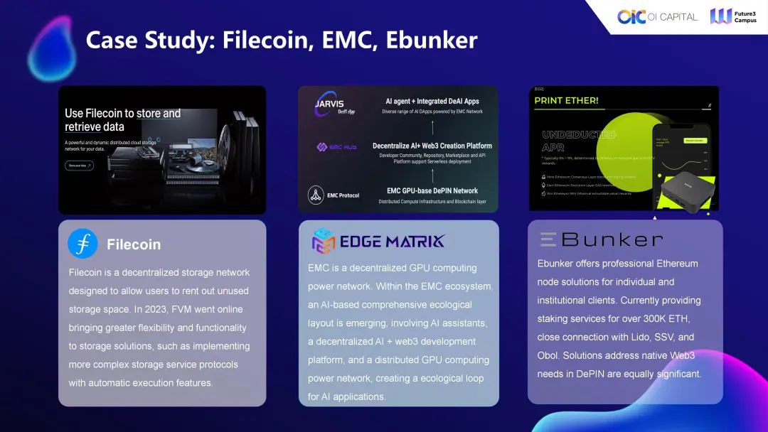 标准基础设施服务网络的案例研究包括Filecoin、EMC和Ebunker。Filecoin是一个去中心化存储网络,允许用户出租未使用的存储空间。EMC是一个基于AI生态布局的去中心化GPU算力网络。Ebunker提供专业的以太坊节点解决方案,为质押服务和满足原生Web3需求。