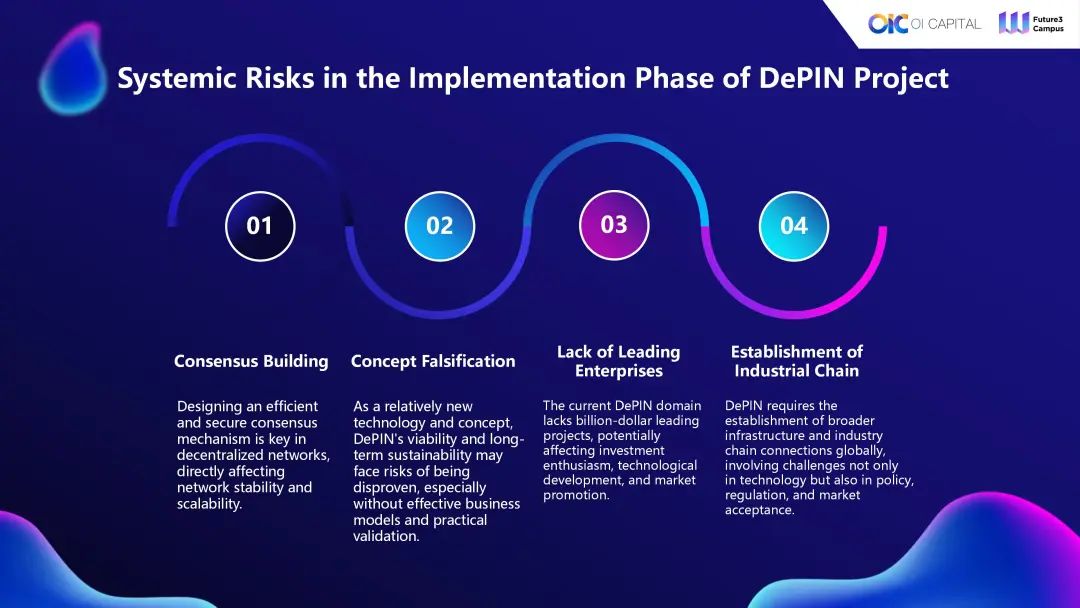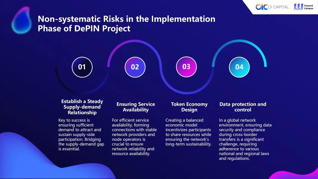 当然,DePIN的发展之路并非一帆风顺。项目在推广阶段面临着监管合规、市场认可、需求验证等挑战,在实施阶段也存在系统性和非系统性风险。