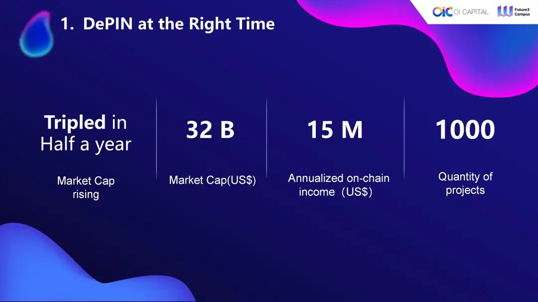DePIN市场在短短半年内经历了惊人的增长。市值翻了3倍,达到了320亿美元;年化链上收入飙升至1500万美元;项目数量猛增至1000个。