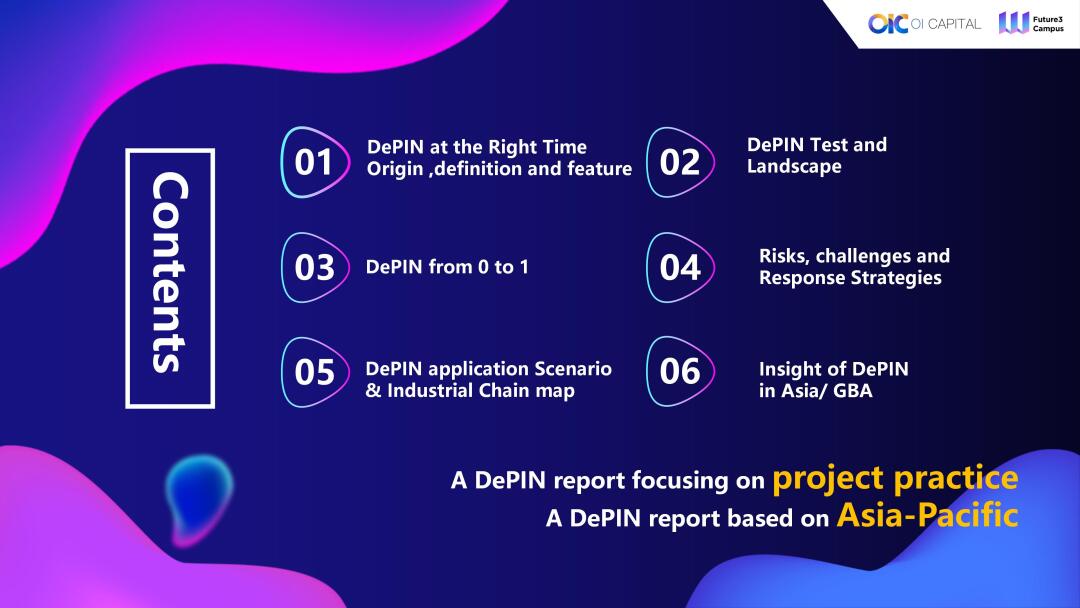 报告由六个部分组成。首先,让我们了解一下DePIN的概念。其次,我们将概览DePIN的生态图景。然后,我们将重点关注报告的核心内容:如何从零到一构建DePIN项目,面临的风险和挑战,以及相应的解决方案。此外,我们还将展示DePIN如何与各个行业融合,并突出在亚太地区,特别是在粤港澳大湾区开发DePIN的优势。