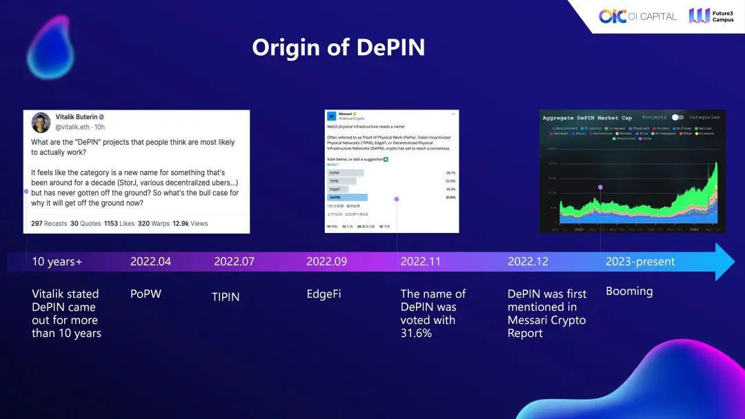 以太坊联合创始人Vitalik Buterin表示,DePIN这一类别在十年前就已经存在。后来出现了PoPW、TIPIN、EdgeFi等概念,2022年11月,社区成员投票决定了DePIN这个名称。如今,DePIN仍在快速发展。