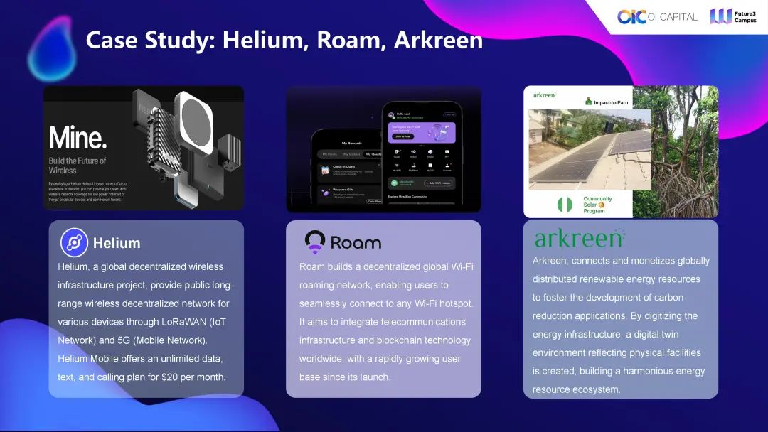 非标准基础设施服务网络中值得关注的案例包括Helium、Roam和Arkreen。Helium是一个全球去中心化无线基础设施项目,为各种设备提供远程无线网络。Roam构建了一个去中心化的全球WiFi漫游网络,整合了电信基础设施和区块链技术。Arkreen连接并盈利全球分布的可再生能源资源,以促进碳减排应用。