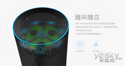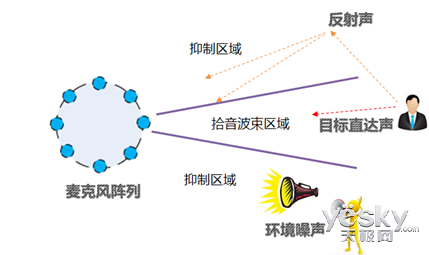 该技术利用安放在音箱顶部的8个麦克风阵列,实现空间上360°的语音信号采集,通过声源定位来确定目标说话人的方向。同时,利用麦克风阵列形成的空域滤波特性,在目标说话人方向形成拾音波束,抑制波束之外的噪音和反射声,此外,结合独特的去混响算法,最大程度的吸收反射声,从而达到去混响的目的。