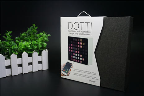 这款DOTTI智能像素灯采用白色纸质包装,简洁却不简单。包装正上方印有DOTTI字样,紧接着用英语和法语对其主要功能进行了简要概括,即“带通知功能的像素灯”。包装正中央贴有一张实物形状的3D卡,从不同角度可以观察到不同颜色、不同形状的图案。如此高逼格的包装设计在其他智能产品中很少看到,这不仅跟产品功能形成了良好呼应,更是为这款产品增添了几分神秘色彩。小编的好奇心又开始作祟,迫不及待得想打开包装一睹其芳容,一探其究竟。