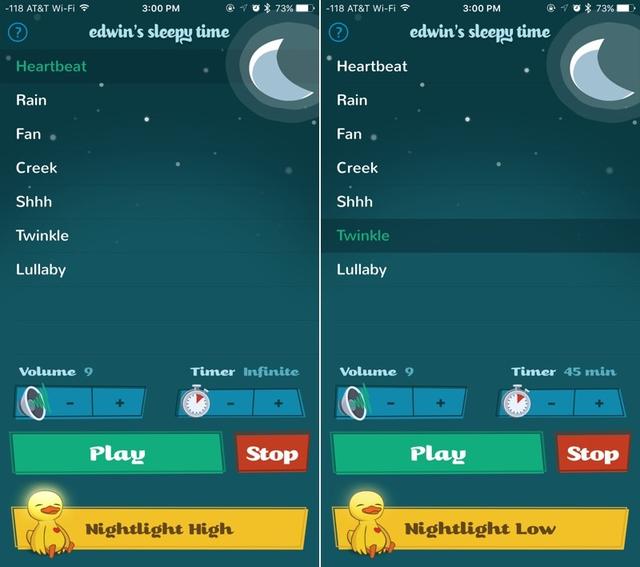 另一款Edwin’s Sleepy Time应用可让家长把Edwin变成一部夜间噪声机和夜灯。该应用可让Edwin播放一些舒缓的声音,比如雨声和心跳,以帮助儿童入睡。正如上文所提到的,它还能控制夜灯的亮度和持续时间。