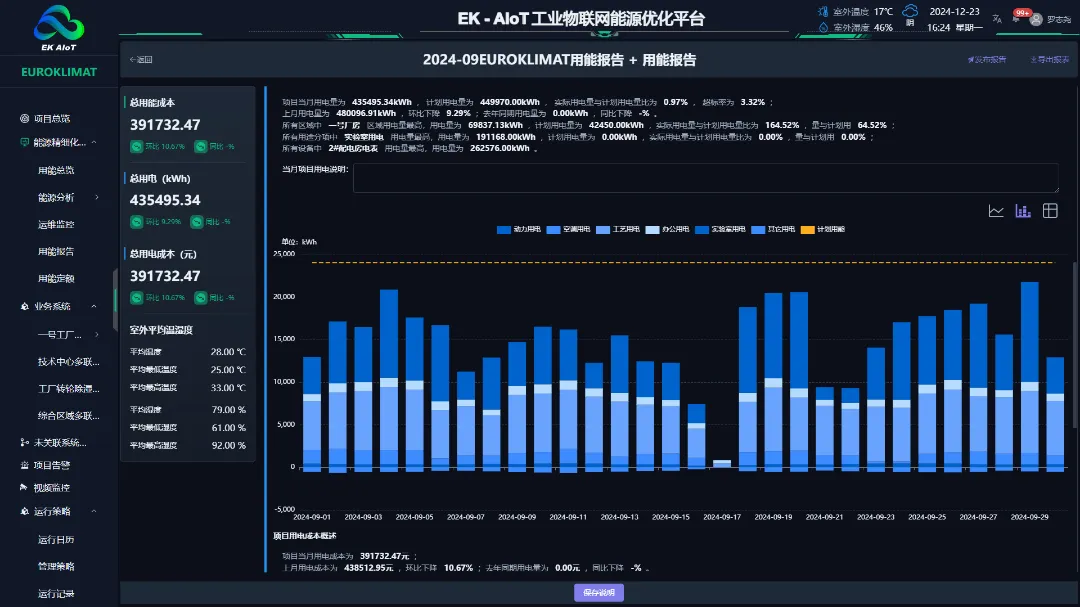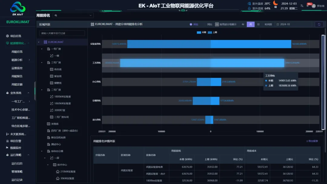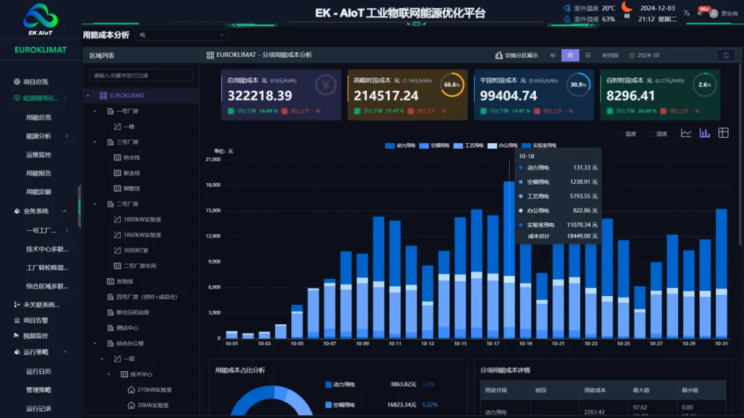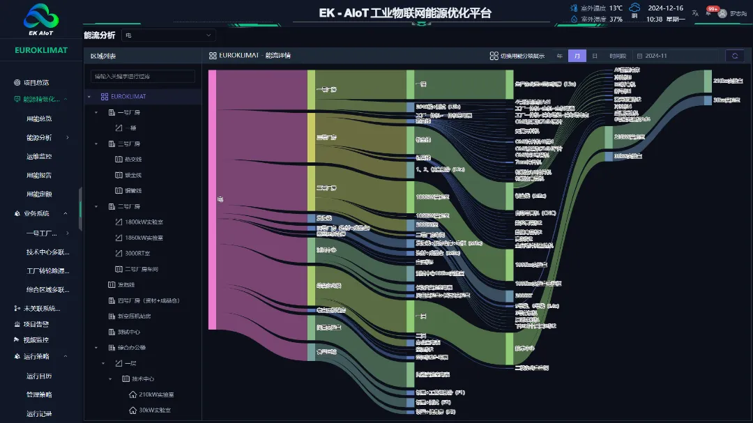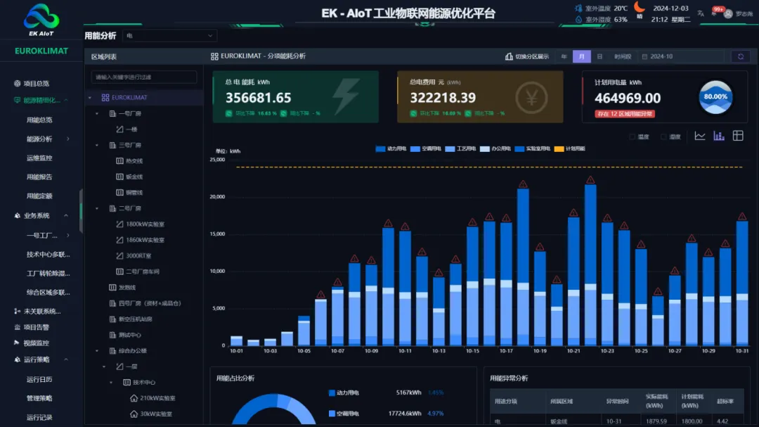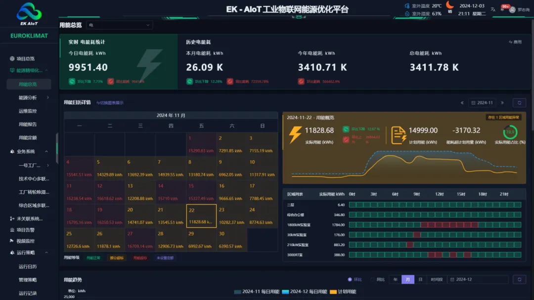 EK-AIoT工业物联网能源优化平台通过多维度数据聚合(包括日期、设备、区域)帮助用户快速掌握能源状况,并自动诊断能耗数据以发现异常,优化用能习惯,实现节能提升。平台提供分时分段用量统计,实现精细化管理和电费支出减少,基于历史能耗数据建立能耗基线,为节能改造提供数据支撑。