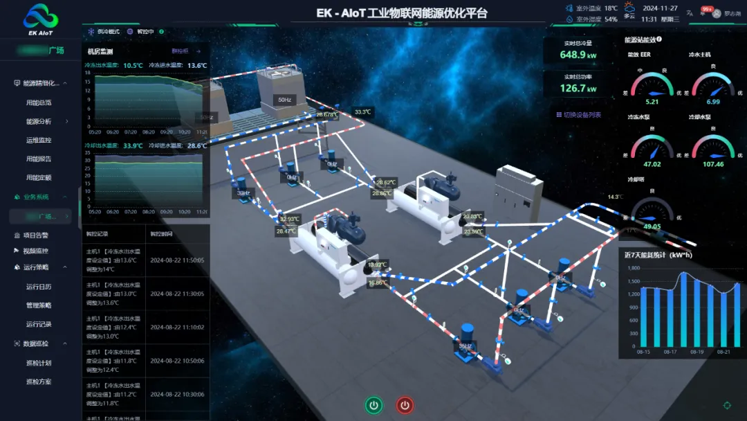 以某商业综合体项目为例,EK-AIoT能源优化平台引入端边云协同控制架构,将本地群控的及时响应优势与云端智控先进算力相结合,在对系统全方位监测的基础上,构建设备机理模型与AI模型的深度融合体系,实现设备的最优运行配置与参数控制,最终节能率高达31.55%。此外,还提供预测性维护,预警故障,确保系统稳定,并结合3D数字孪生技术,实时监控,提高运维效率,为客户提供节能、高效的系统运行。
