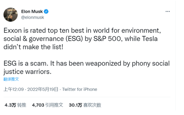 马斯克对此极为恼火,在推特上大发牢骚,直称:“ESG是一个骗局,是社会正义伪君子们的武器。”还将石油公司埃克森美孚与从事新能源汽车行业的特斯拉进行对比,以显示标普500在评级上的不公。