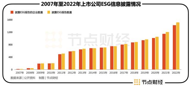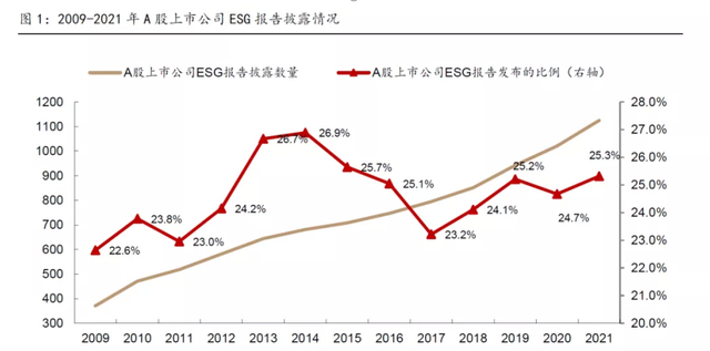 宏观环境及政策驱动下,A股上市公司们也不得不加紧拥抱变化。《2022中国A股公司ESG评级分析报告》数据显示,2022年共有1267家A股上市公司披露ESG信息,较2021年增加351家。上市公司ESG披露率为30.86%,较2021年增加约4个百分点。这是国内上市公司ESG披露率首次突破三成。中国国际经济交流中心副理事长王一鸣则预测,今年将有一半的上市公司披露ESG报告。
