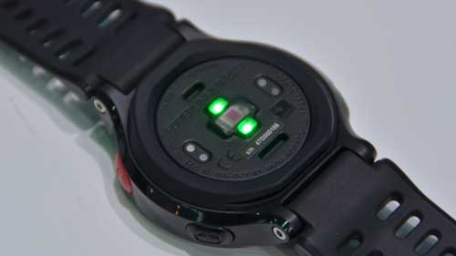 机身背面设计与Forerunner220有所不同,通过光电红外感测可直接读取心跳脉搏。